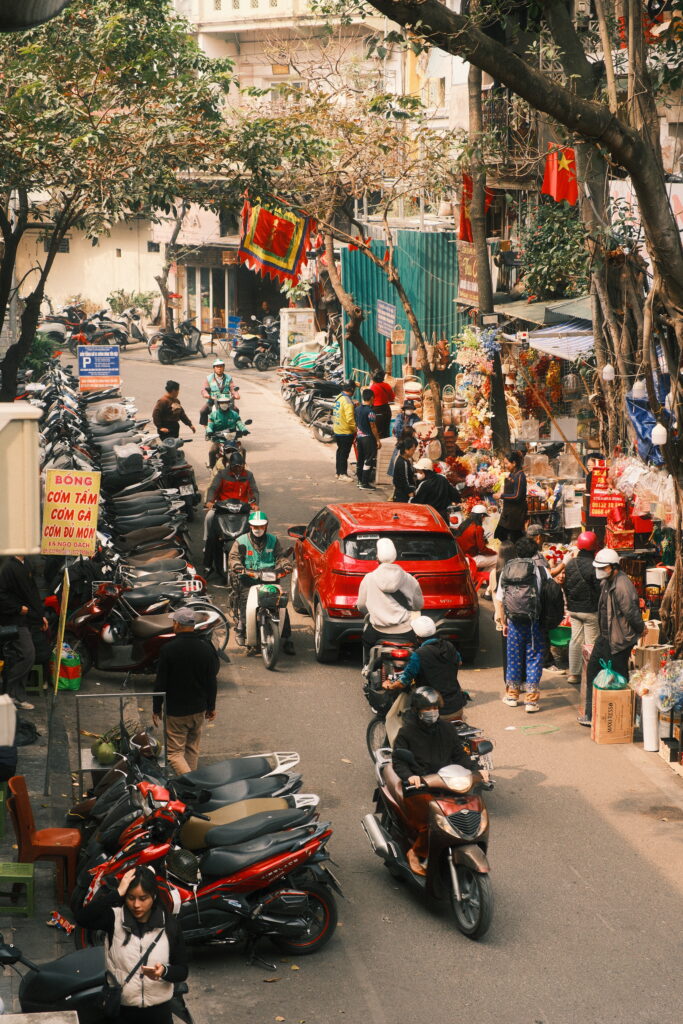 W Hanoi życie toczy się na ulicy. To nie jest metafora, tylko fakt. Ulice pełnią funkcję targowiska, restauracji, warsztatu, salonu fryzjerskiego, parkingu i przestrzeni spotkań towarzyskich jednocześnie. Dlatego granica między przestrzenią publiczną a prywatną praktycznie nie istnieje. W efekcie życie przenosi się na chodniki, do bram i na skrawki asfaltu między motorowerami.